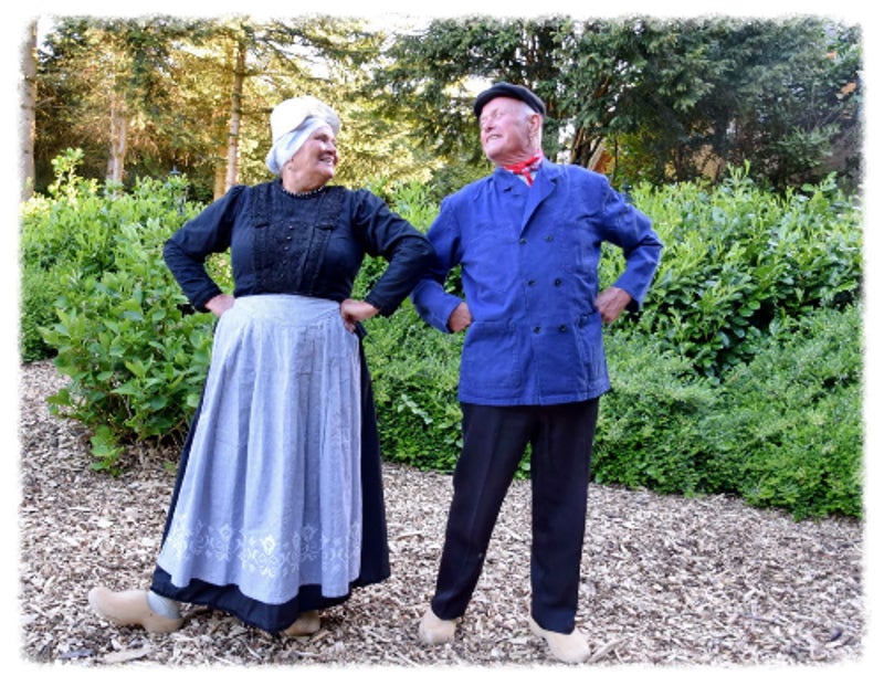 The group dances in a traditional costume, taken from agricultural West-frisia between 1880 and 1920. Dressed as they would be on a typical day out during the week, the ladies wear a hat known as a warp, simple jewellery, an apron and a black chatelaine bag. The men wear a black suit consisting of trousers, waistcoat and a form of tailcoat and also a farmer's cap. The dancing is done in shoes and clogs. When clog dancing, the ladies wear a blue working apron and the men a peasant¹s smock with a red handkerchief.